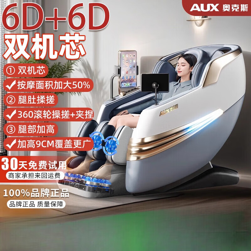 奥克斯(AUX)双6D新款按摩椅子家用全身全自动太空舱电动小型豪华椅 双芯版Max白灰【76指触感+6D玉石双倍享受】