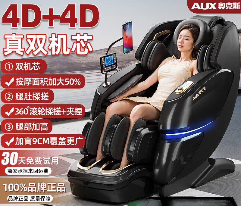 奥克斯(AUX)双4D品牌新款智能按摩椅子全自动家用全身多功能太空舱电动 双芯版【72指触感/真4D+4D双倍享受】超高配黑