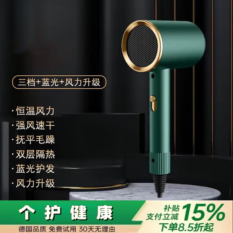 戴森德乐电吹风大功率不伤发发廊吹风机负离子锤子吹风筒学生家用吹风筒冷热风吹头发 绿[1300w]三档调节+蓝光负离子 强风速干+抚平毛躁