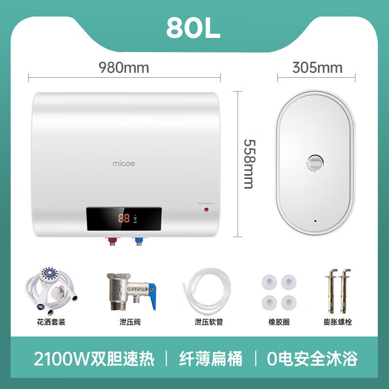 四季沐歌(MICOE)电热水器50升60升80升储水式家用速热超薄扁桶卫生间洗澡 白色80L 数码显示