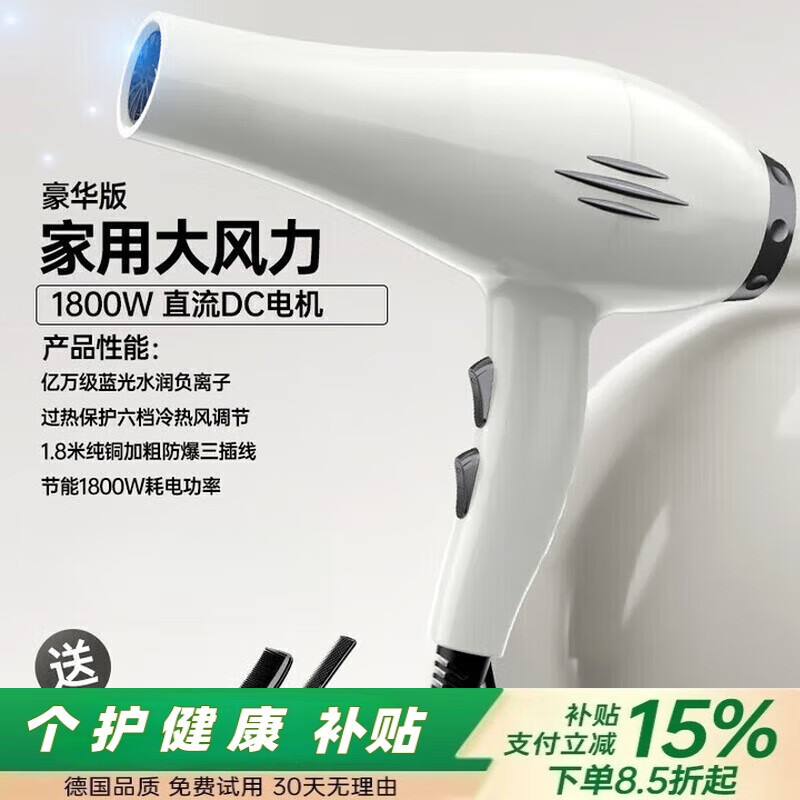 戴森德乐理发店电吹风机家用负离子护发大风力发型师专用大功率速干冷热风 奶白色-【1800W]家用标准版【大风力1.8】 蓝光水润负离子+过热保护