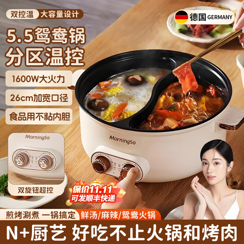 德国品牌大容量电煮锅速沸不粘鸳鸯火锅家用多功能一体锅家用电火锅多功能一体快煮锅宿舍电锅专用大容量电锅 【鸳鸯锅】 5.5L 加厚加深 三年粘锅包退
