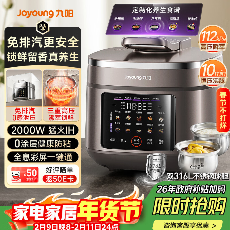 九阳(Joyoung)尊享电压力锅免排汽1代 5L超高压112KPa猛火IH智能预约0涂层母婴316L双球胆煲汤电饭煲Y-50IHZ6