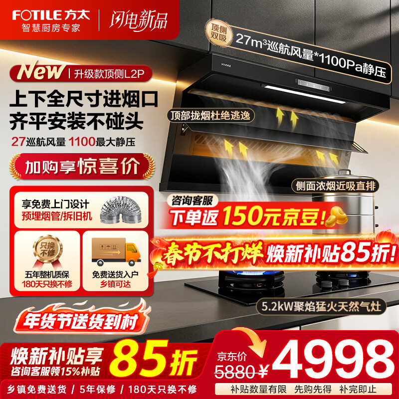 方太(FOTILE)顶侧双吸抽吸油烟机L2P 大吸力27风量变频齐平橱柜油烟机燃气灶套装 家用挥手开关油烟机灶具套装 【两件套】烟机+5.2KW烈焰灶TF29B