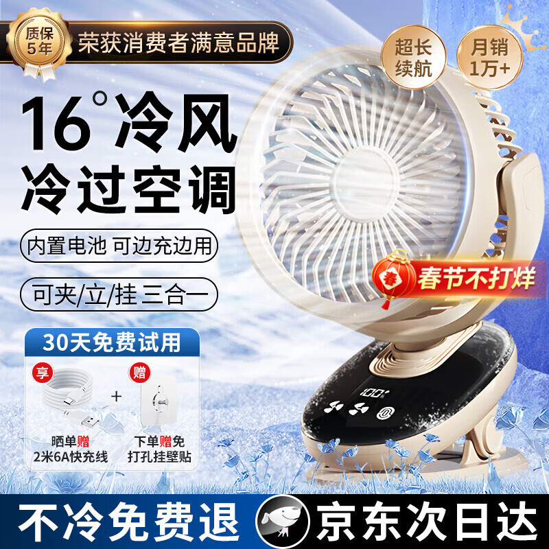 MUBE【德国】充电小风扇桌面风扇静音宿舍学生USB台式夹子壁挂床头电风扇小空调空气循环扇大风力家用 米白色-大容量丨急速吹凉风丨轻音