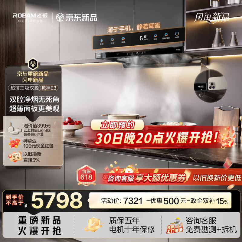 老板【风神系列】抽吸排油烟机灶具套装欧式双腔家用29.5大吸力一级能效静音烟灶联动E3+D2