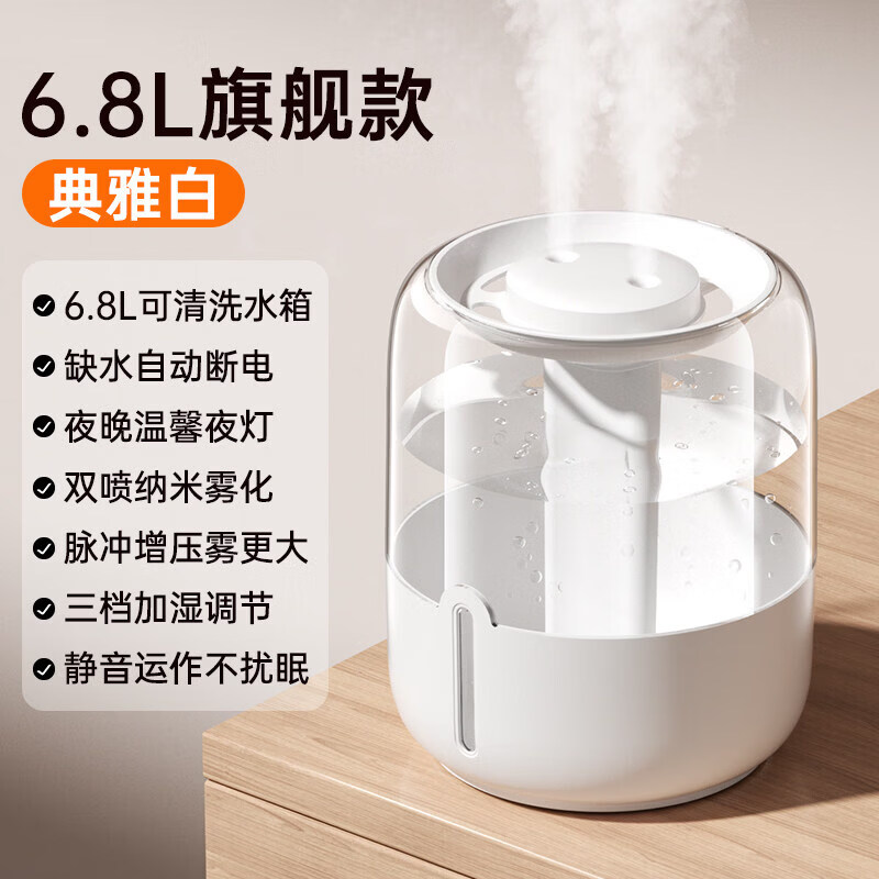 小米宝宝6.8大雾量加湿器家用卧室静音办公室桌面宿舍大容量便携孕妇婴儿补水空调屋空气加湿喷雾2025新款 典雅白旗舰款6.8L超大容量+纳米双喷+静音补水+