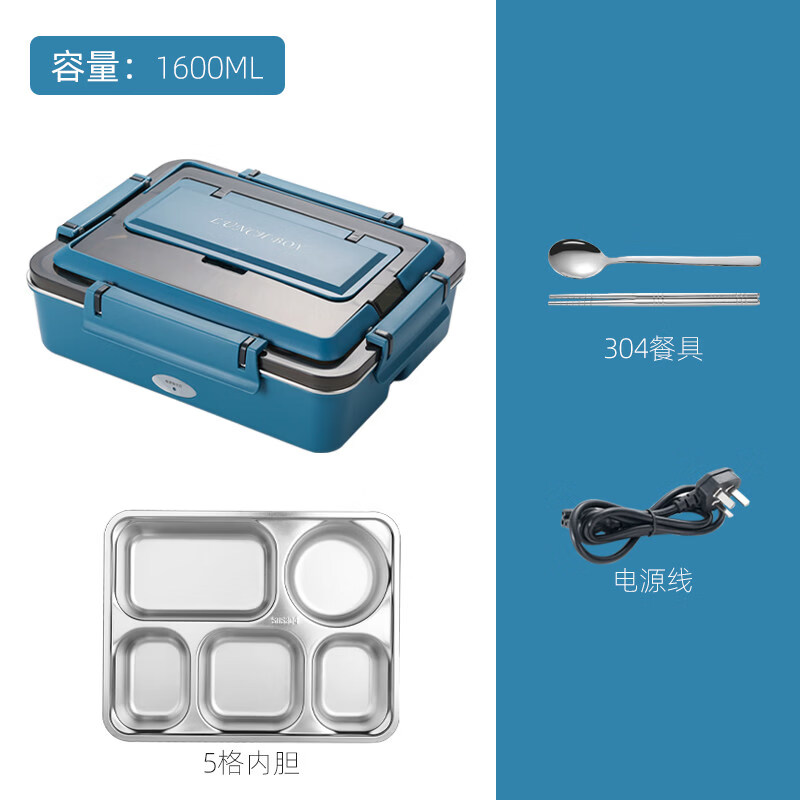 小米宝宝电热饭盒可插电加热304不锈钢上班族学生保温饭盒便当盒便携餐盒 1L 蓝色5格(无汤碗)【免注水电热】
