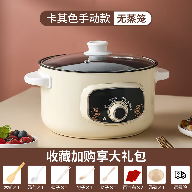 小米宝宝电煮锅多功能家用学生宿舍煮面小电锅电炒菜炒锅蒸煮一体锅电火锅 22CM卡其色(机械版) 适合1-2人