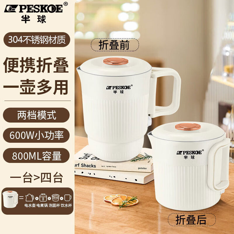 半球便携式电热水壶304不锈钢烧水壶折叠旅行出差不锈钢电水壶家用泡面杯保温杯宿舍露营电热水杯 0.8L 【304】便携折叠壶