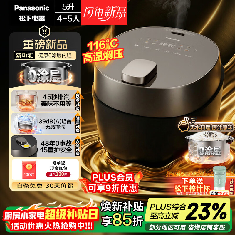 松下(Panasonic)【国家补贴】小元煲电压力锅0涂层5L高压锅0涂层电饭煲4-5人不锈钢多功能饭锅智能预约NF-PDS500-K