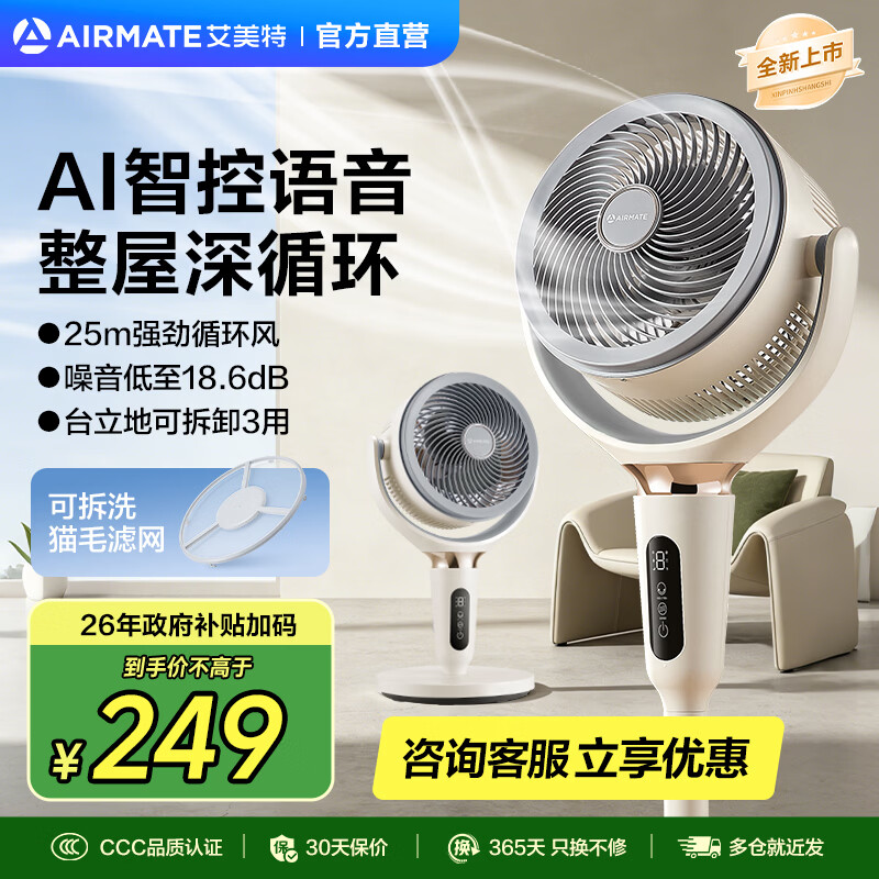艾美特【26年重磅升级驱蚊款】空气循环扇 电风扇大风量家用立式升级加高落地扇卧室宿舍轻音净化抗菌 【标配语音款】珍珠白