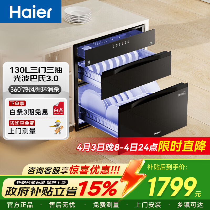 海尔(Haier)消毒柜家用嵌入式消毒碗柜EB130max高温二星级消杀餐具碗筷收纳柜厨房消毒机 二星级 130L 三门三抽