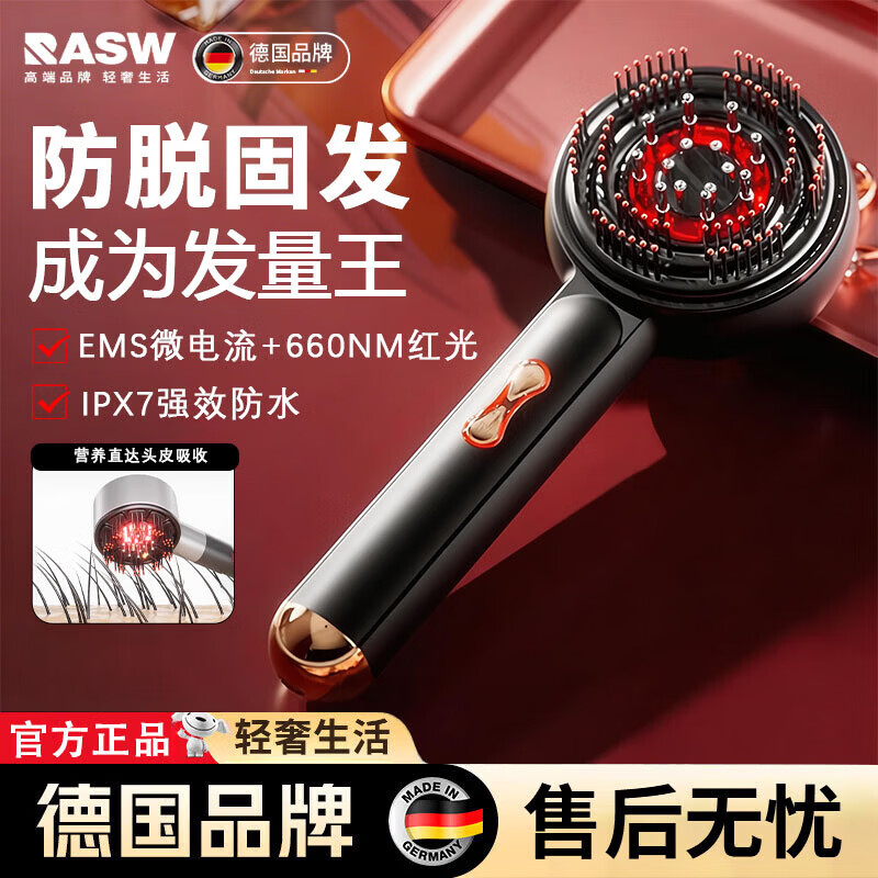 RASW德国头皮按摩器生发梳红光渗透米诺地尔防脱发按摩梳导液头皮上药器女士精油养发梳生日礼物送女友 【暗黑色】头皮养护 | 丰盈密发 | 震动按摩 揉按舒压入眠丨头部红光按摩丨节日送礼首选
