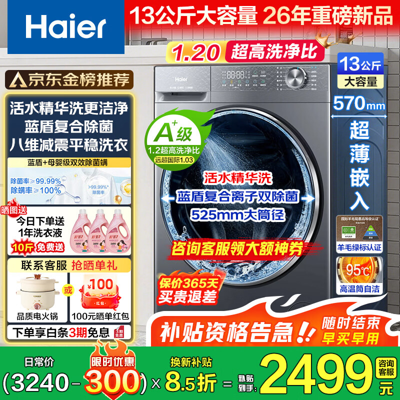 海尔滚筒洗衣机全自动11公斤超薄零嵌入带烘干大筒径大容量八维减震蓝盾除菌一级能效以旧换新品补贴 13公斤丨超薄嵌入+蓝盾除菌+智能投放+精华洗 单洗
