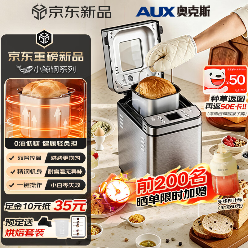 奥克斯(AUX)全自动不锈钢面包机揉面一体家用多功能小型早餐机恒温发酵0油低糖烤吐司多士馒头酸奶 新品小鲸钢