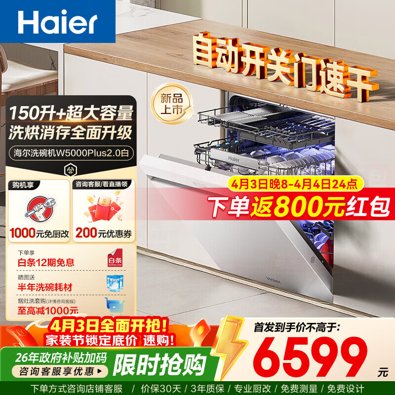 海尔(Haier)麦浪洗碗机【W5000Plus2.0白】嵌入式163升升级双面洗大容量七星消杀60000Pa大水压10天净存 【高端款】嵌入式双面洗系列 【自动开关门】 EYZW2286U1茉莉白