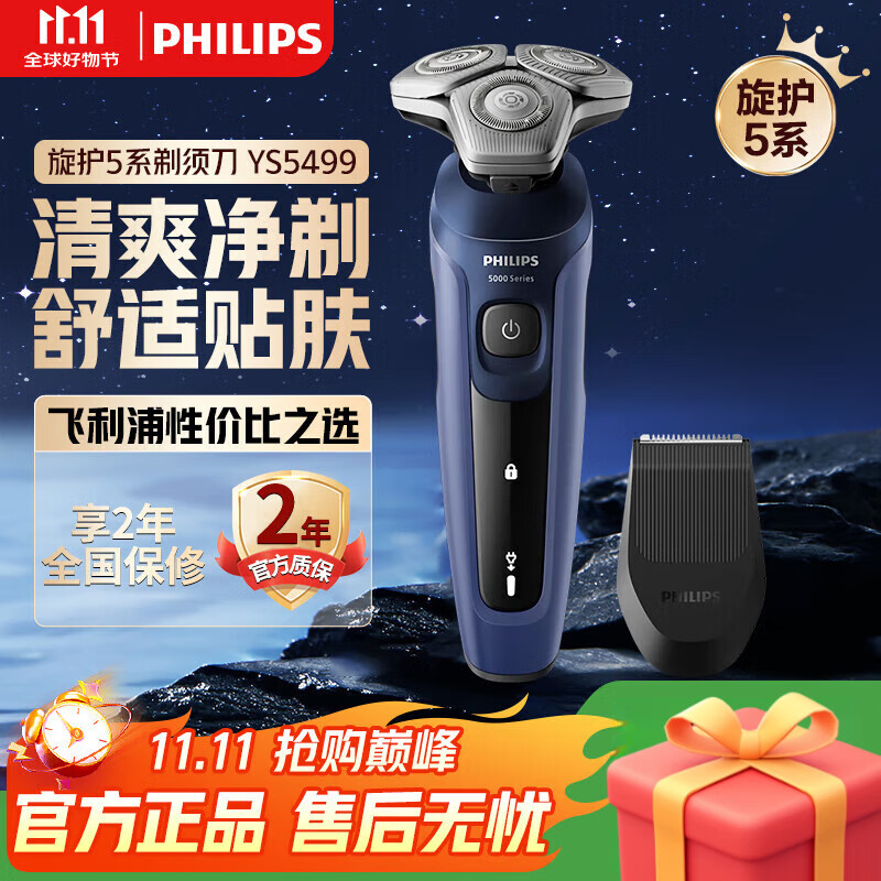 飞利浦(PHILIPS)剃须刀电动刮胡刀胡须刀肌能感应动力自适应进口精钢V型刀片生日礼物送男友送老公【全新蜂巢5系】 全新旋护5系 YS5499/04