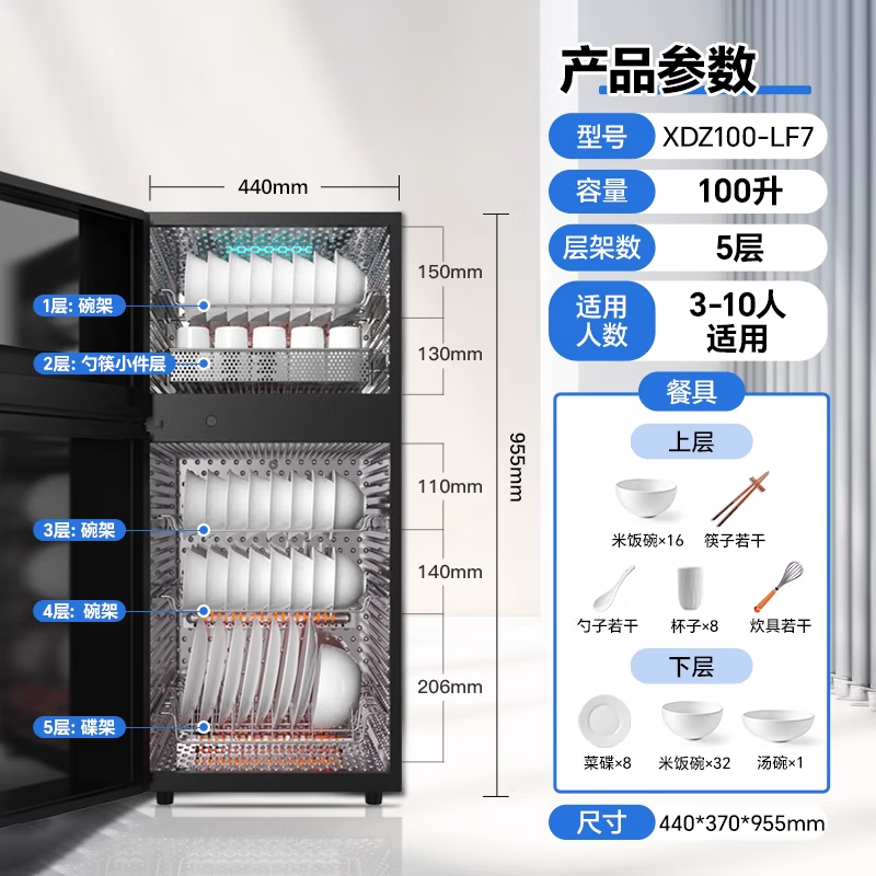康宝(Canbo)LF7消毒柜家用立式大容量紫外线砧板消毒碗筷柜收纳烘干一体 二星级 100L 5层|不锈钢层架 密网架
