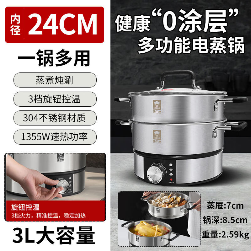 康巴赫304不锈钢电蒸锅多功能一体多层蒸煮锅火锅家用小型电热锅 24CM-304不锈钢电蒸锅单蒸屉