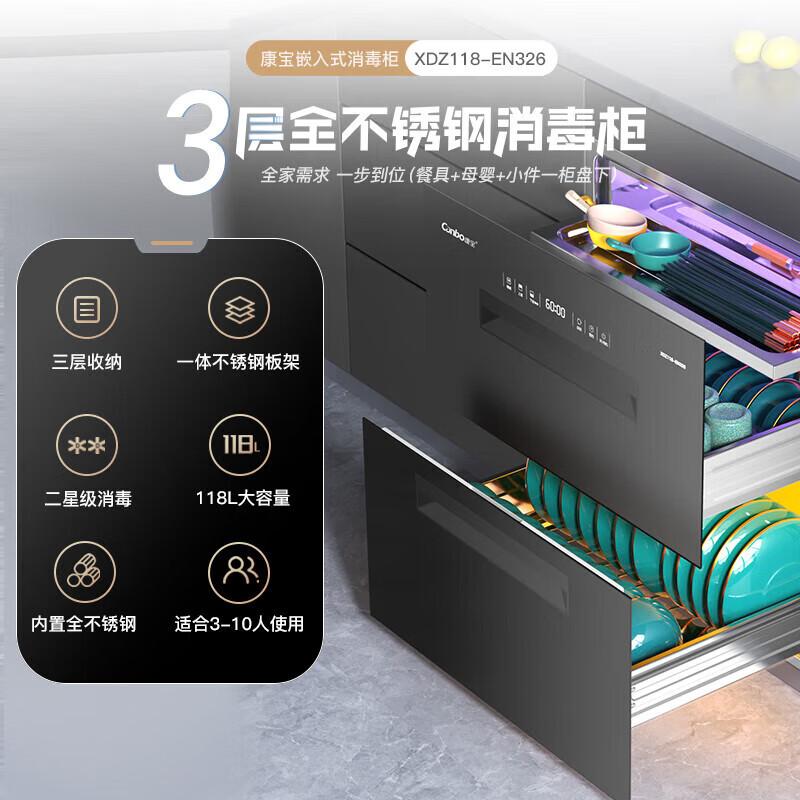 康宝(Canbo)EN326家用嵌入式消毒柜全不锈钢高温二星级板架收纳烘干一体 二星级 118L 全不锈钢