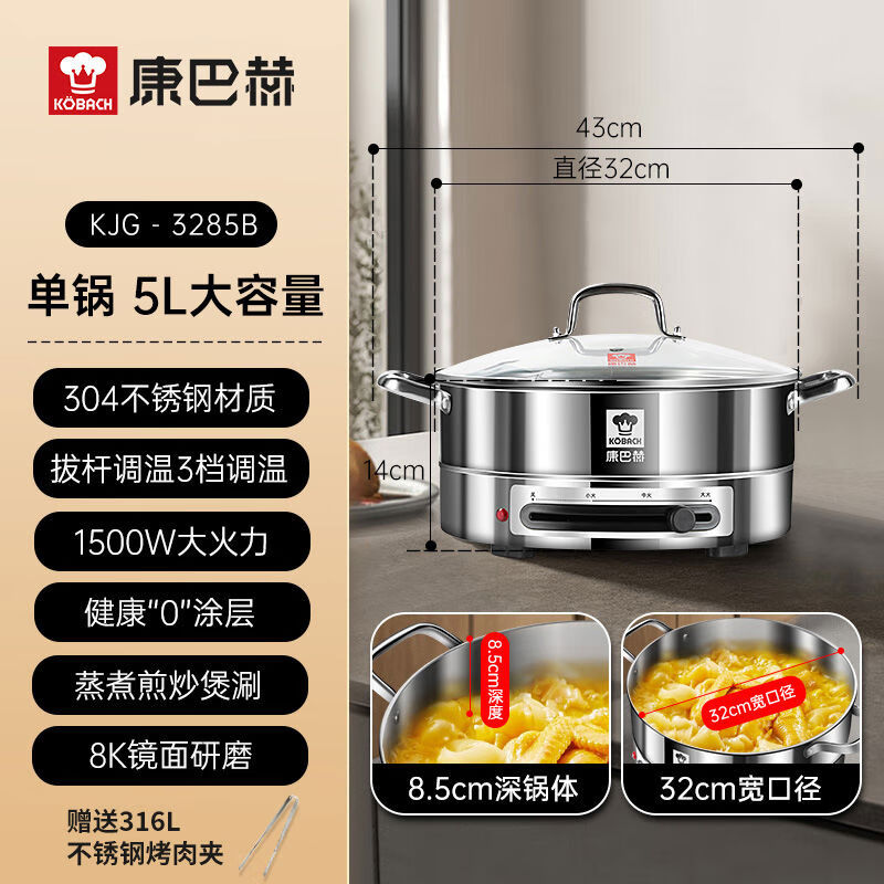 康巴赫电煎锅304不锈钢多功能家用蒸煮锅加深大容量无涂层电饼铛 32CM-新升级电煎锅