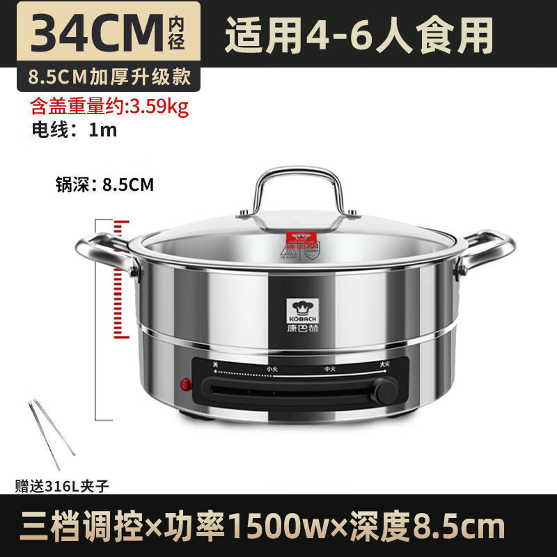 康巴赫官方304不锈钢电蒸锅家用平底烙饼锅多功能加深平底煎火锅 34CM-加深8点5CM多功能电蒸煎火锅