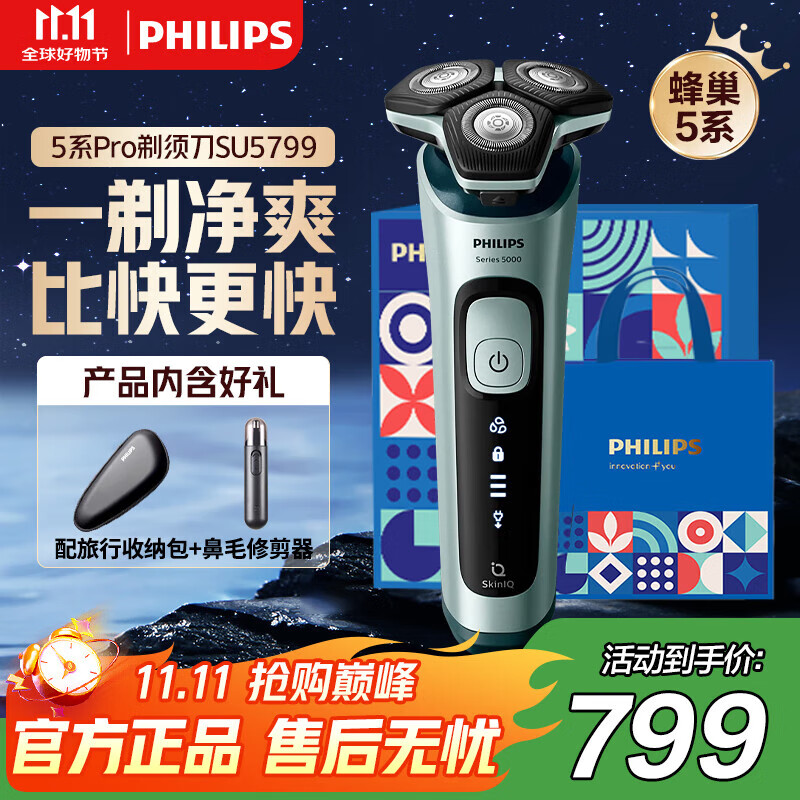 飞利浦(PHILIPS)剃须刀电动刮胡刀SkinIQ肌能感应剃胡刀送老公送男友【蜂巢5系-高配性能-配鼻毛器】 SU5799礼盒装
