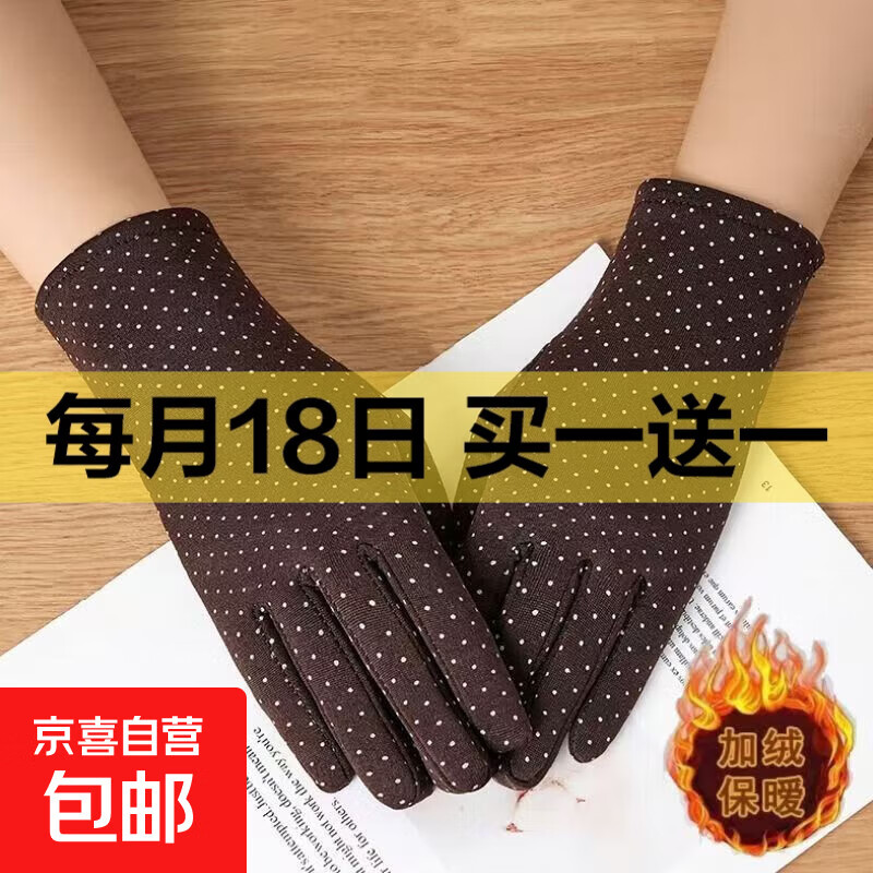 秋冬加绒保暖手套女款薄绒加厚广场跳舞防风防寒骑开车休闲棉手套 波点保暖手套-咖啡-1双