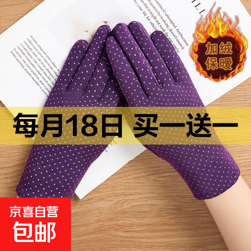 秋冬加绒保暖手套女款薄绒加厚广场跳舞防风防寒骑开车休闲棉手套 波点保暖手套-紫色-1双
