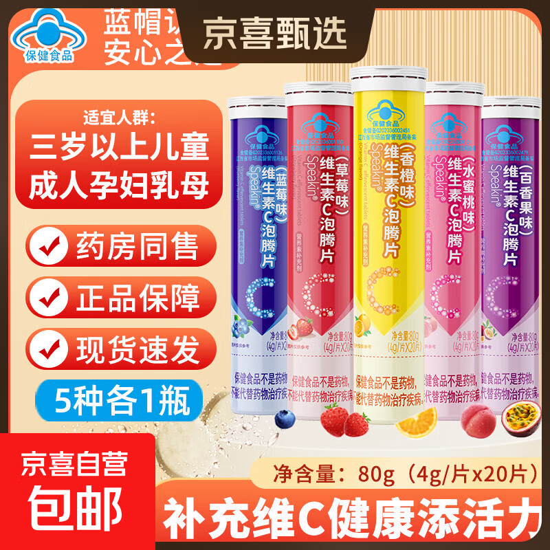 维生素C泡腾片儿童成人蓝帽VC复合维生素维他命固体饮料夏日冷泡 5瓶【均衡组合】香橙1蓝莓1草莓1水蜜桃1百香果1
