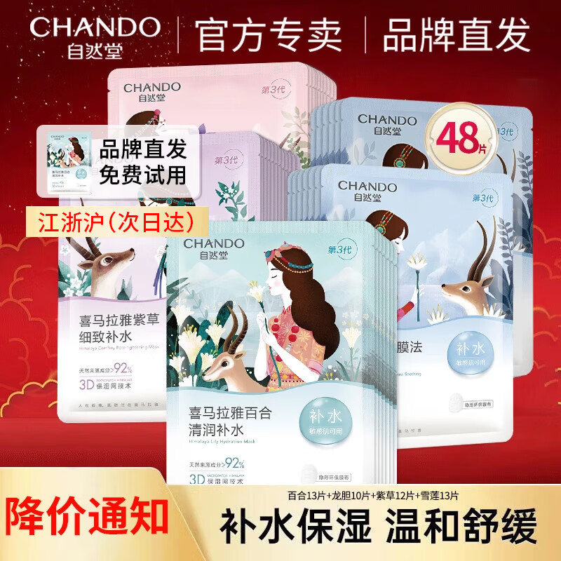 自然堂(CHANDO) 面膜女 男士补水保湿清洁平衡焕亮美丽白皙护肤品面膜新年礼物 48片 百合13片+龙胆10片+紫草12片+雪莲13片