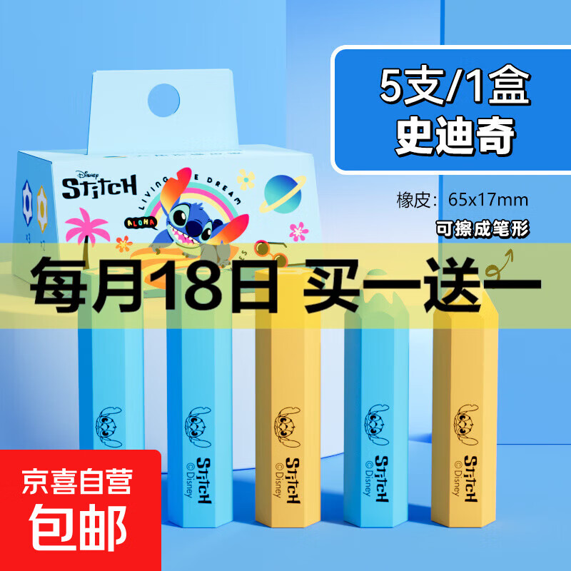 迪士尼真集屑铅笔橡皮擦无屑超干净不留痕小学生专用卡通可爱幼儿园儿童无毒2b考试可削笔形像皮檫 5块/盒【史迪奇】