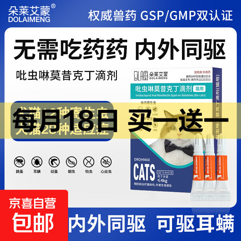 吡虫啉莫昔克丁滴剂宠物猫用内外驱虫滴剂驱寄生虫猫咪驱虫药犬用内外一体狗狗驱虫药跳蚤虱耳螨 【猫用0.4ml 3支装】猫用≤4kg
