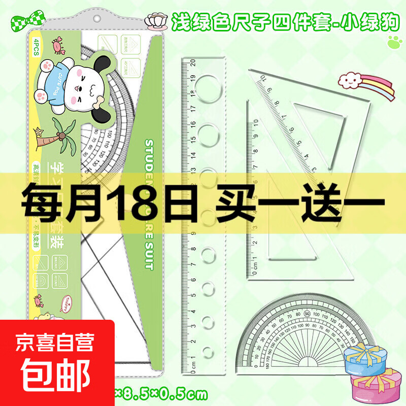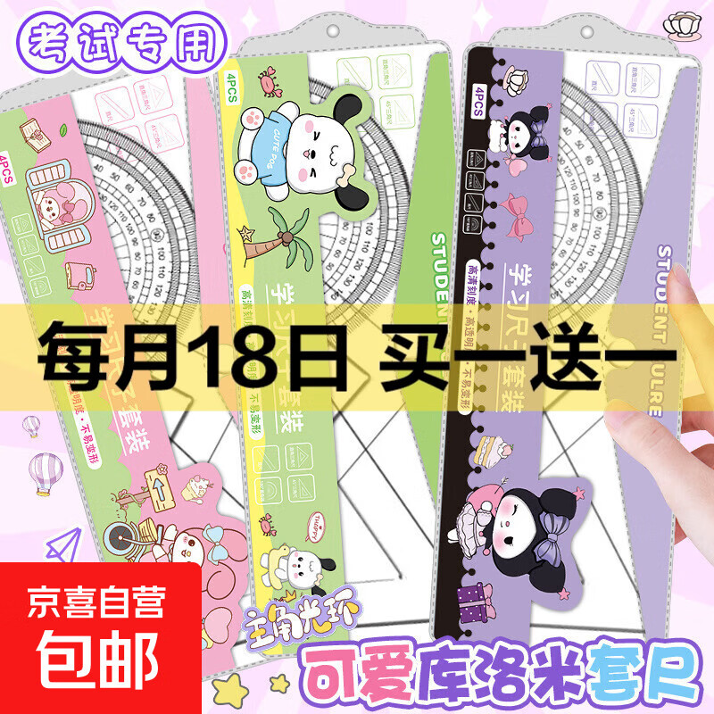 学生测绘套装套尺卷尺软尺卡通套尺学生尺子套装创意卡通小学生专用直尺三角板量角器四件套 超多款式混发