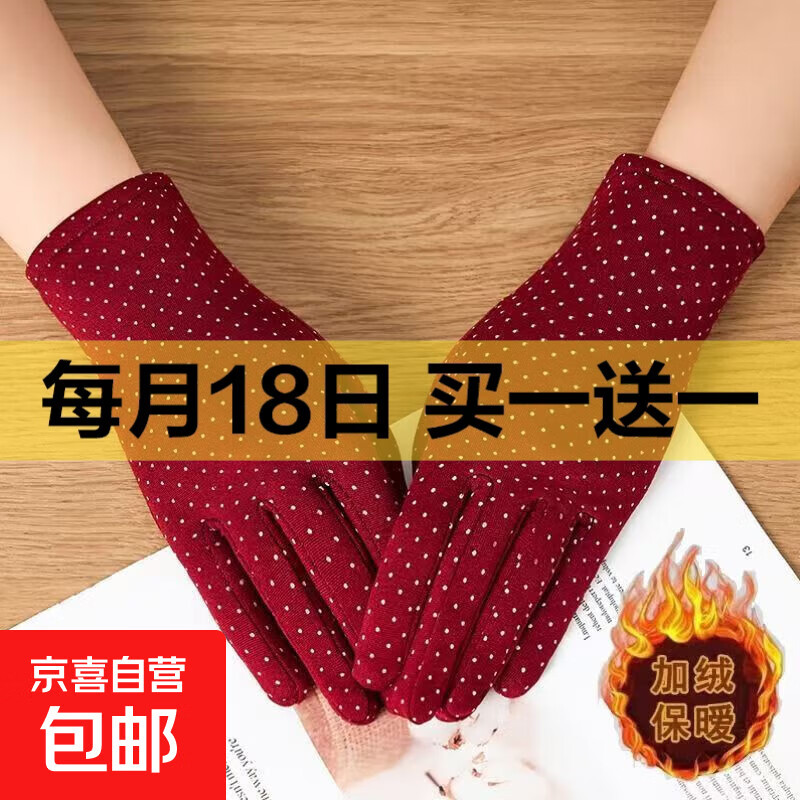 秋冬加绒保暖手套女款薄绒加厚广场跳舞防风防寒骑开车休闲棉手套 波点保暖手套-枣红-1双