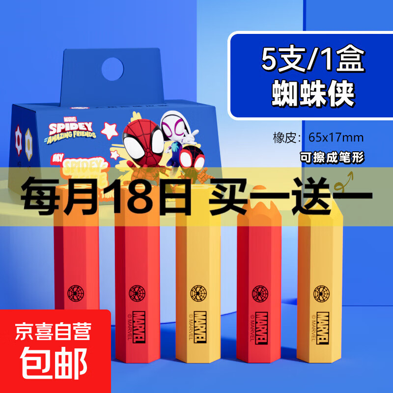 迪士尼真集屑铅笔橡皮擦无屑超干净不留痕小学生专用卡通可爱幼儿园儿童无毒2b考试可削笔形像皮檫 5块/盒【蜘蛛侠】