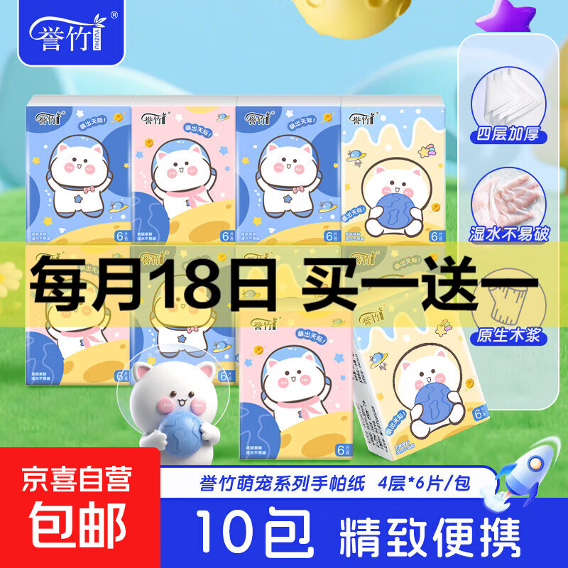 誉竹萌宠手帕纸可爱小包便携式纸巾餐巾纸随身装卫生纸面巾纸学生 萌宠系列手帕纸 4层 6片*10包