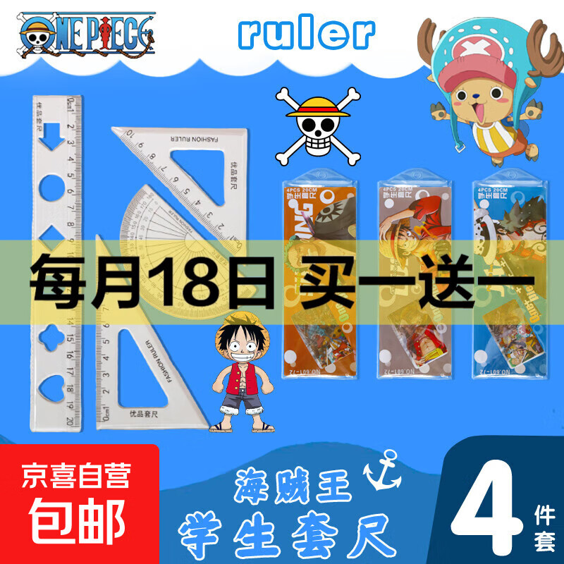 正版授权小学生初中量角器直尺三角尺套装绘图测量学习用品高颜值套尺ins 海贼王按扣套尺|硬尺四件套|款式随机