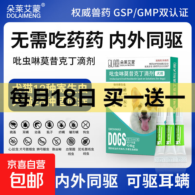 吡虫啉莫昔克丁滴剂宠物猫用内外驱虫滴剂驱寄生虫猫咪驱虫药犬用内外一体狗狗驱虫药跳蚤虱耳螨 【犬用0.4ml 3支装】犬用≤4kg