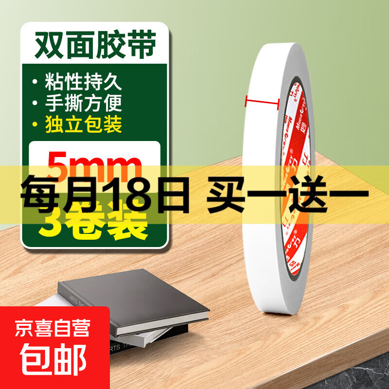 高粘度易手撕强力双面胶超薄办公用胶带棉纸双面胶带学生手工专用固定纸胶条 双面胶,宽5mm*10y,3卷
