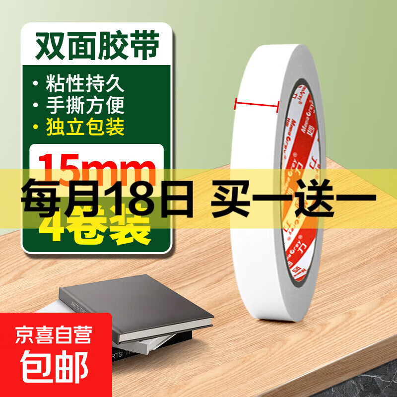 高粘度易手撕强力双面胶超薄办公用胶带棉纸双面胶带学生手工专用固定纸胶条 双面胶,宽15mm*10y,4卷