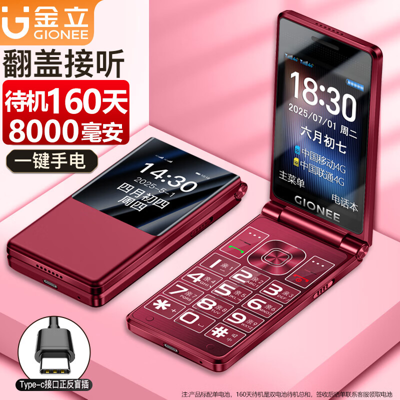 金立G4000毫安 老年手机4G全网通翻盖老年机超长待机大字体大声音大屏按键老人机老年人专用手机 红色