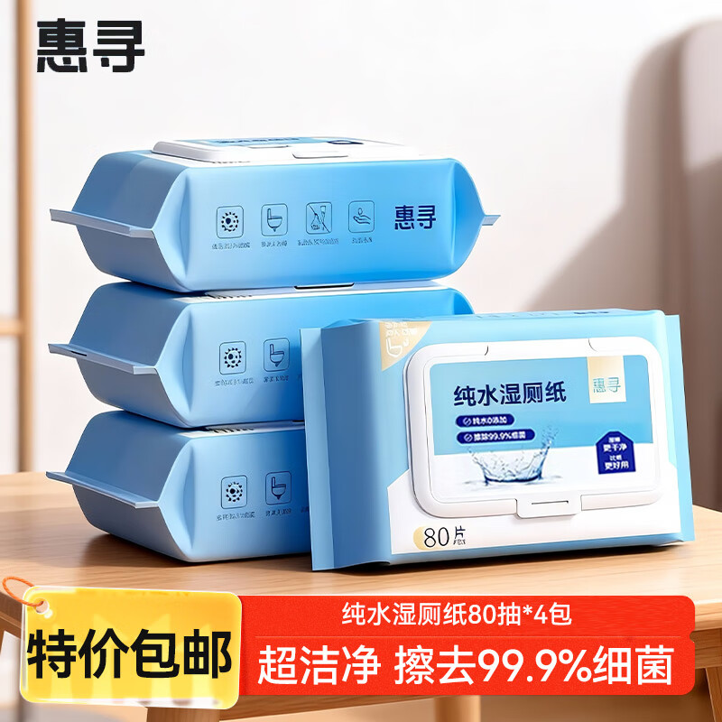 惠寻纯水湿厕纸80抽*4包 清洁湿纸巾湿巾擦除99.9%细菌大包家庭装厕纸