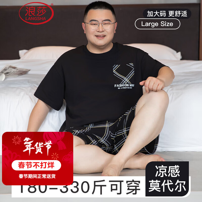 浪莎睡衣男大码春秋莫代尔凉感短袖套装胖子加肥加大家居服330斤可穿