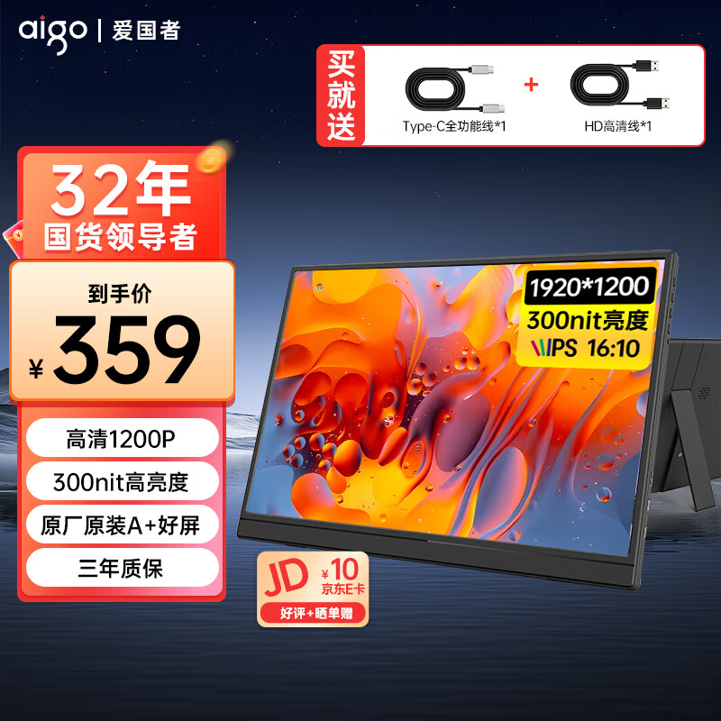 爱国者aigo16英寸便携式显示器 扩展屏笔记本电脑副屏 电竞办公炒股电脑扩展屏一线通1200P