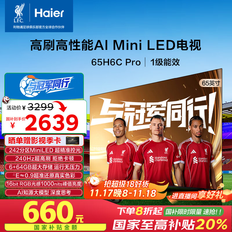 海尔65H6C Pro 65英寸240Hz高刷242分区背光MiniLED智能4K超高清6+64G护眼游戏电视换新国家补贴一级