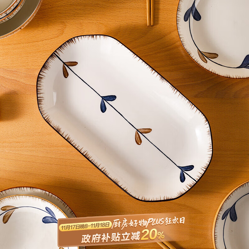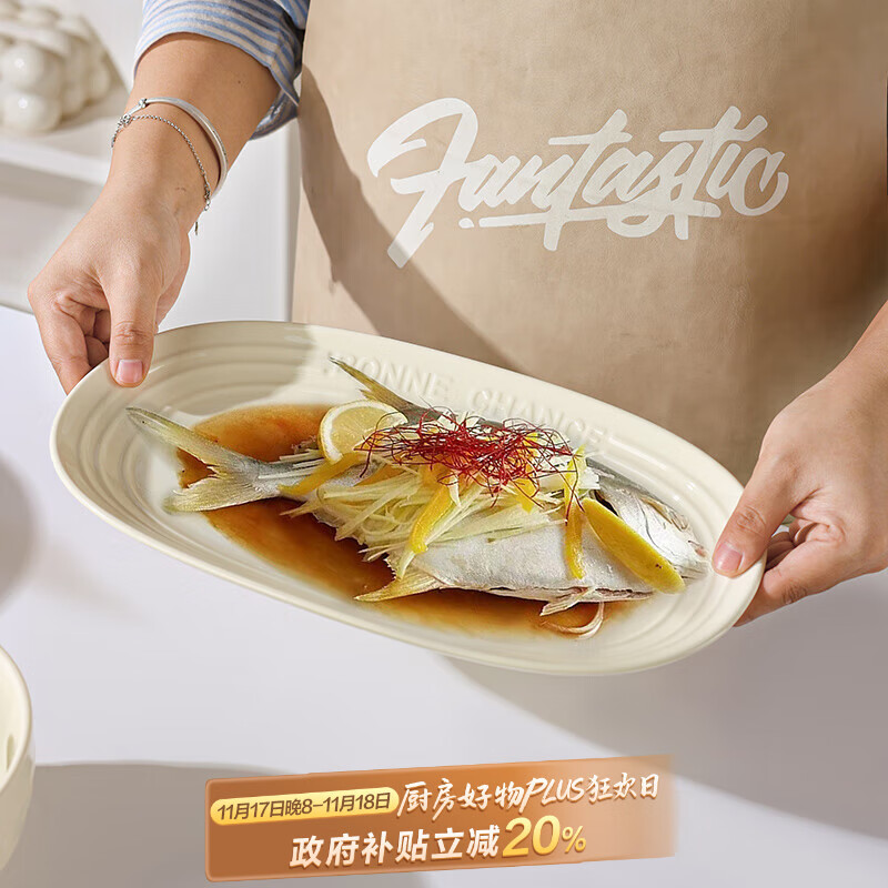 贺川屋陶瓷鱼盘奶油风高颜值陶瓷盘釉下彩12英寸蒸鱼盘菜盘子
