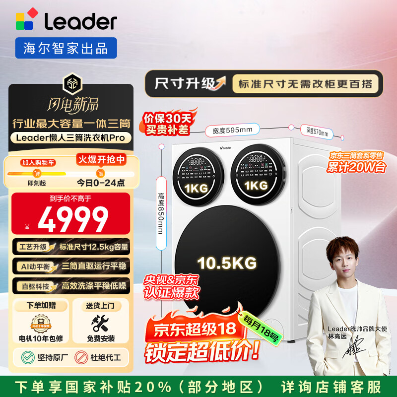 统帅(Leader)海尔智家懒人三筒洗衣机Pro 12.5公斤直驱全自动 XQGL125-MBDE699WU1 三桶 国家补贴 林高远同款