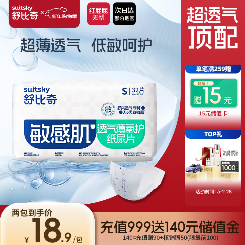 舒比奇[无腰贴]透气薄婴儿纸尿片S32片(4-8kg)尿不湿无腰贴